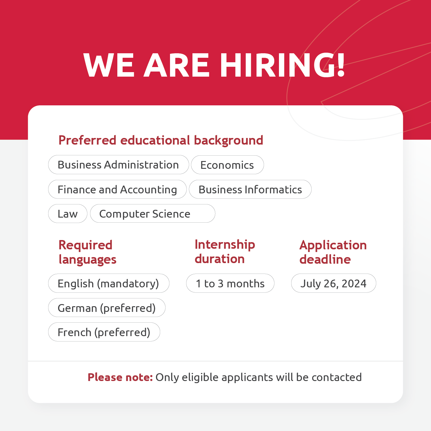 We welcome applications from graduates in Business Administration, Economics, Finance, Accounting, Business Informatics, Law, and Computer Science, proficient in English, German, or French.